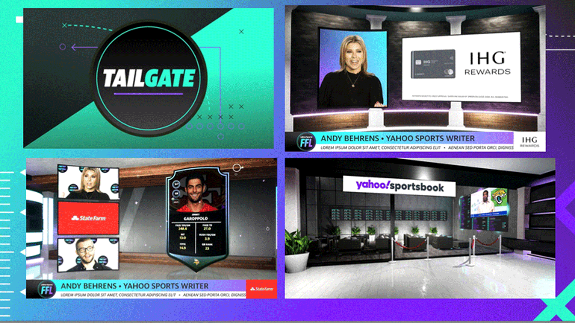 • We also worked with inter-company partner Engadget to create a virtual environment for their 2021 CES presentation, and then again with Yahoo Sports for their Tourney Bracket Now! coverage of the 2021 NCAA Basketball Tournament.