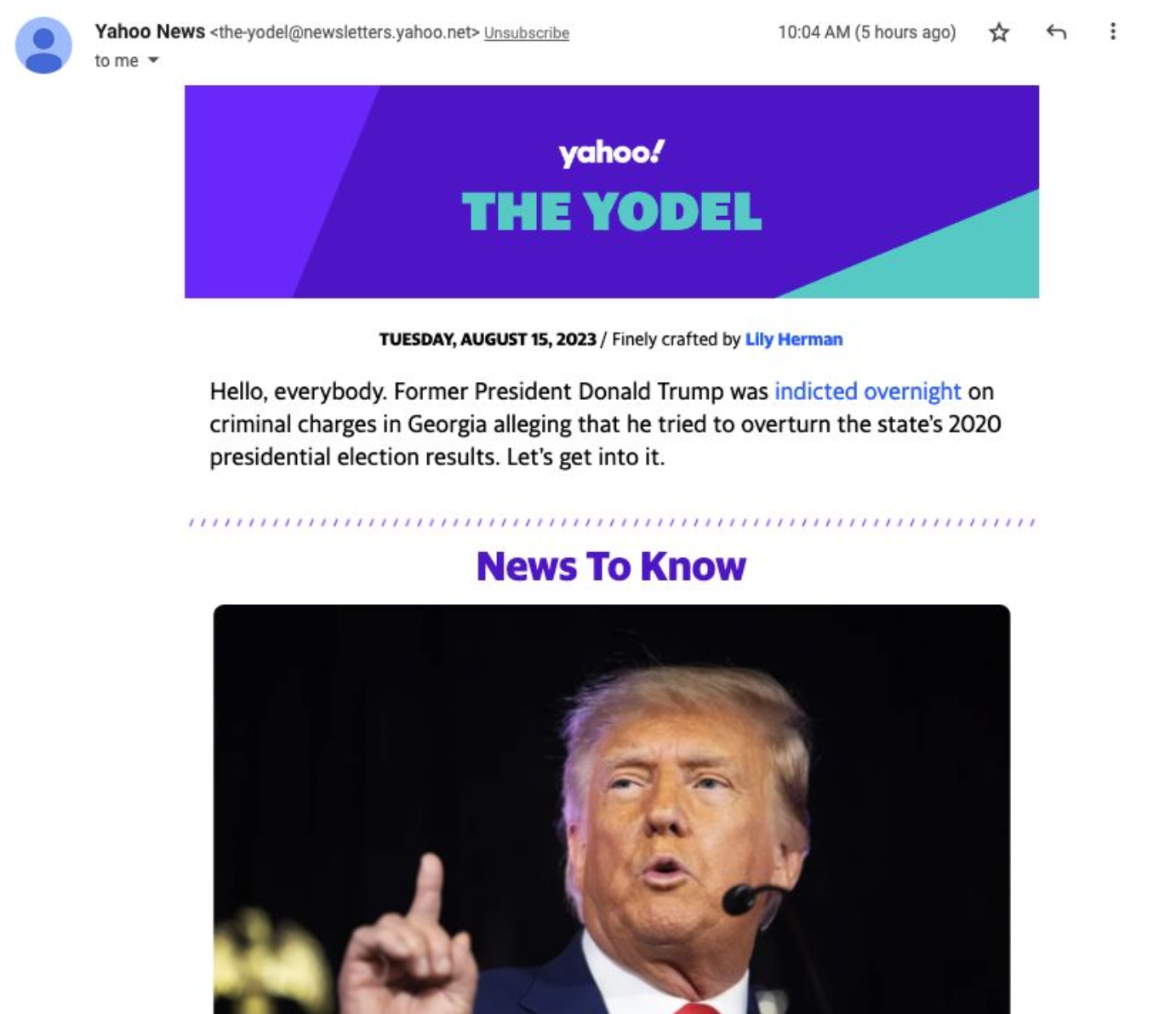 The Ask: A leading priority for the Yahoo News leadership entering 2023 was making a play for the revitalized brand in the increasingly popular e-newsletter space. While an existing product was in use, new, dedicated leadership and writers had come aboard to lead a revamp, and a fresh coat of paint was in order as well. Yahoo News’ mission statement at the time was “The world’s best guide to the internet” with an emphasis on “helping our audience make sense of current events and their lives.” With this in mind, it was determined that the Yodel’s new voice and aesthetic should be a little more puckish and pop, but with wiggle room as not to seem tonally inappropriate when more serious stories and content were in that day’s headlines.